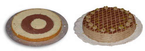 Jeden Bisquit 2 – 3 mal durchschneiden. Aus jeder Schicht mit einem Rundausstecher zwei Ringe ausstechen. Und abwechselnd hellen und dunklen Bisquit versetzen.